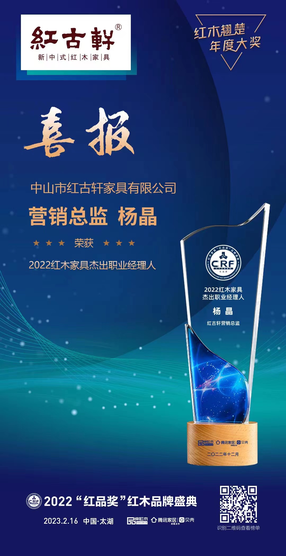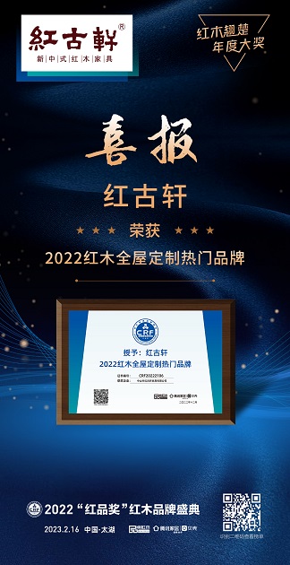 在第13屆中國紅木家具品牌頒獎典禮上,紅古軒憑借強勁實力,以及對市場的精準布局,破紀錄地連續(xù)13年,斬獲“中國紅木家具十大受歡迎品牌”!紅古軒并以獨到的紅木高端整裝實力,榮獲“2022紅木全屋定制熱門品牌”;大會并授予紅古軒“主席團主席單位”;營銷總監(jiān)楊晶女士,并斬獲“2022中國紅木家具杰出職業(yè)經理人”。四大殊榮,紅古軒再次以實力,彰顯品牌的巨大魅力與品牌價值,也印證了紅古軒在行業(yè)的地位。