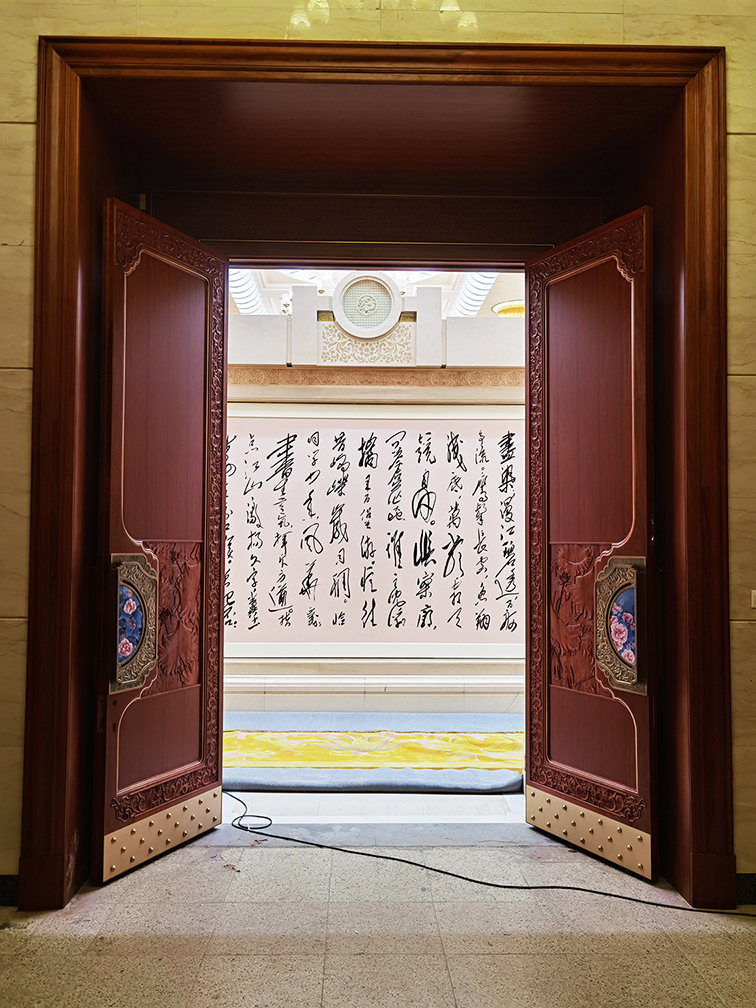 歷經(jīng)夜以繼日的奮戰(zhàn),6組紅木雕刻大門木飾面和護(hù)墻板、湘繡大屏風(fēng)的雕刻線框及黑酸枝紅木案桌作品,于2022年8月11日順利送達(dá)人民大會(huì)堂湖南廳。整個(gè)作品以獨(dú)樹一幟的至臻工藝,充分彰顯湖南新時(shí)代的和諧精神風(fēng)貌,亦展現(xiàn)了中國傳統(tǒng)文化的獨(dú)特魅力,得到了人民大會(huì)堂管理處及湖南省人民政府領(lǐng)導(dǎo)的高度評(píng)價(jià)。