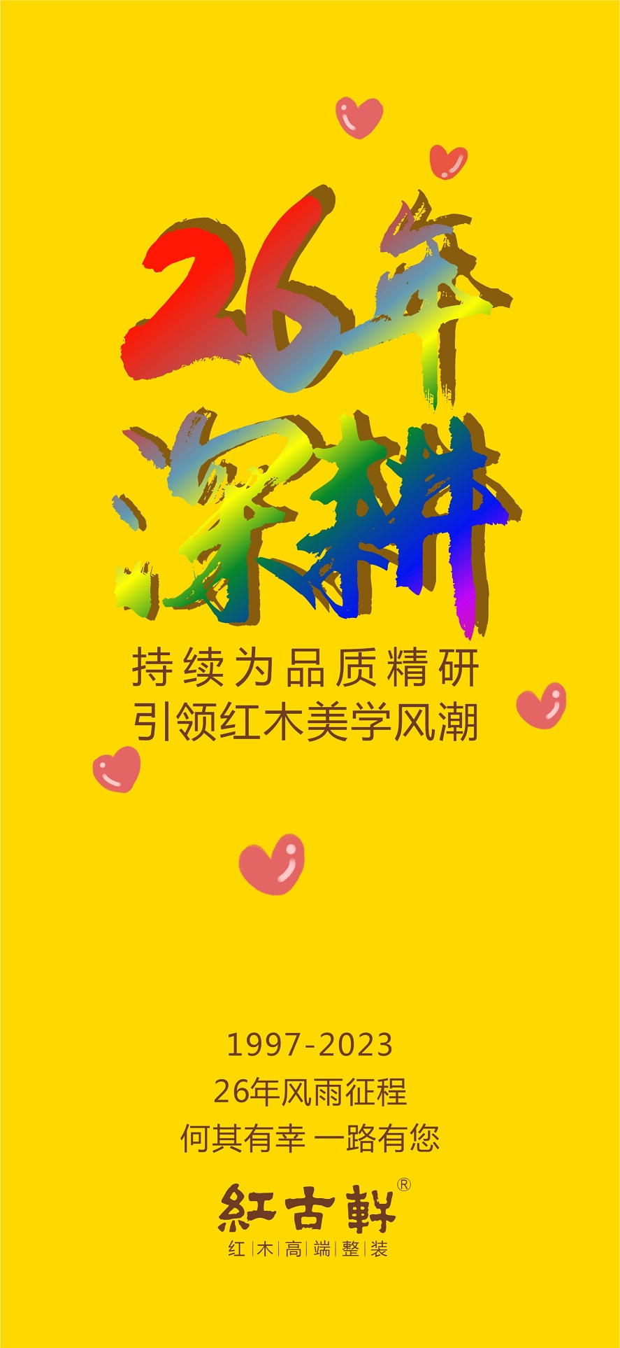 從1997到2023,紅古軒26年以來,一直秉持匠心精神,打造紅木傳世品質(zhì)。展望未來,大國盛世,文化復(fù)興,國潮崛起,紅古軒將不負(fù)韶華,用不忘初心的奮斗,書寫下一個(gè)26年更加絢麗多彩的畫卷。